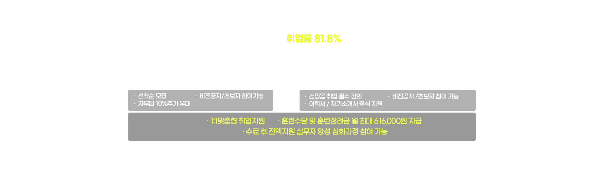 학원 자체의 인프라도 쾌적 하였고, 강사님이 저희에게 신경을 많이 쓰는 모습을 보여주었으며, 무엇보다 같이 수강한 수강생들이 의기투합하여 모두 열심히 하는 분위기가 형성되어 더 열심히 수강했던 것 같습니다.