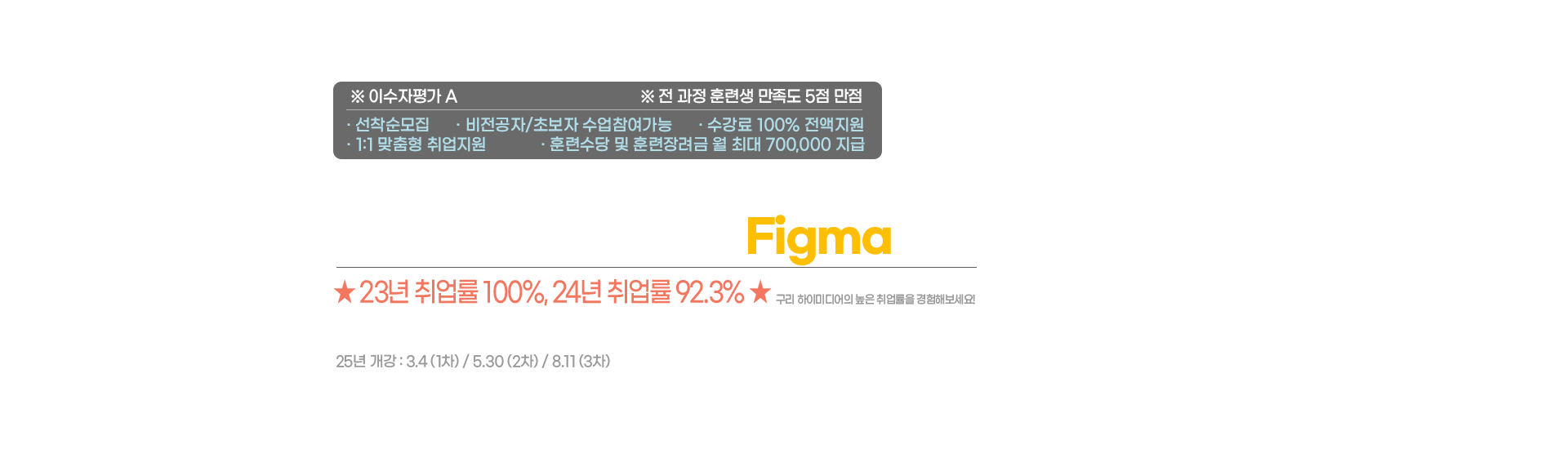 김정원, 김도경 취업생다른 교육과정 이후에 심화 과정에 대한 필요성을 인지해서 관련 교육을 찾아보다가 하이미디어의 교육과정을 확인해보니 포르폴리오 중심의 커리큘럼에서 많은 도움을 받을 수 있을것 같아 선택하게 되었습니다. -